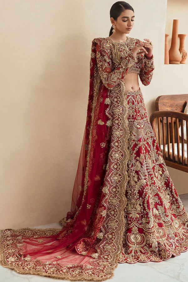 Amber is an ode to a perfect classical beauty indulged in visionary red color bringing bridal fantasy to life. A net lehenga choli set features extravagant details of makesh, naqshi, dabka, and katdana further meticuled with gotta and crystal work. It comes with an intricately embroidered net dupatta rendered with cut work details on the border concluded with pure Kiran lace used to design a timeless fashion piece for your big day.