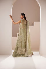 Celeste is a refined organza shirt with a sensual dabka and cut dana handwork neckline, paired with a matching crushed raw silk bottom. The ensemble is elegantly adorned with delicate chandi embellishments, which cascade across both the shirt and the dupatta, creating a harmonious and timeless look.